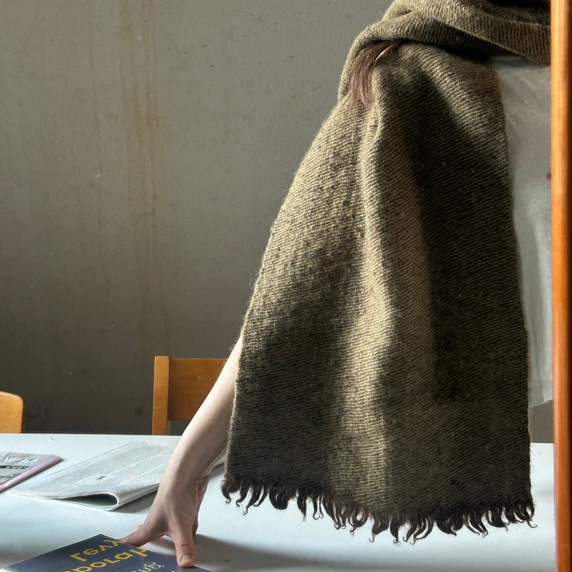 In the photos pictured, the white scarf consists of an undyed grey Spelsau lambswool warp and undyed mohair weft. The green and brown scarf consists of an undyed brown Spelsau lambswool warp and a naturally dyed mohair weft dyed with scotchbroom.